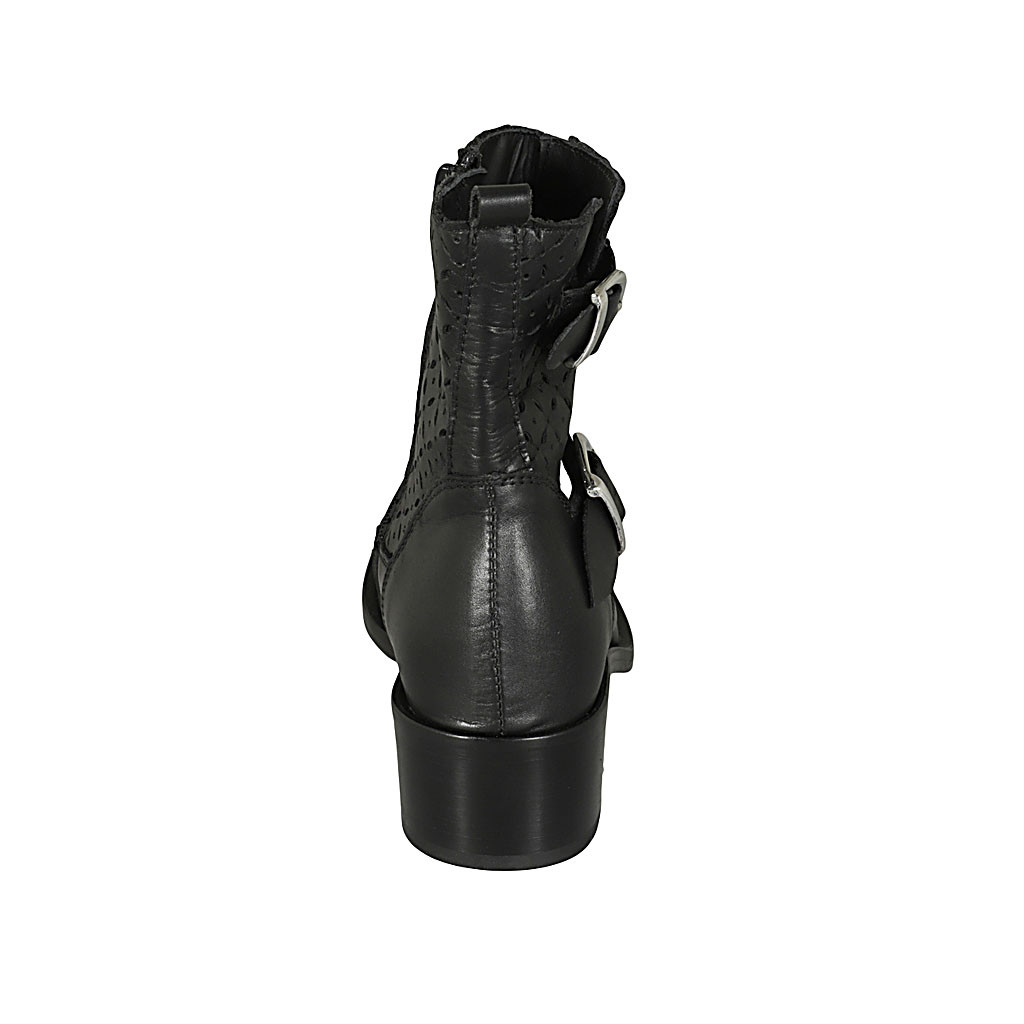 Woman's laced ankle boot with zippers, studs and buckles in black leather heel 6