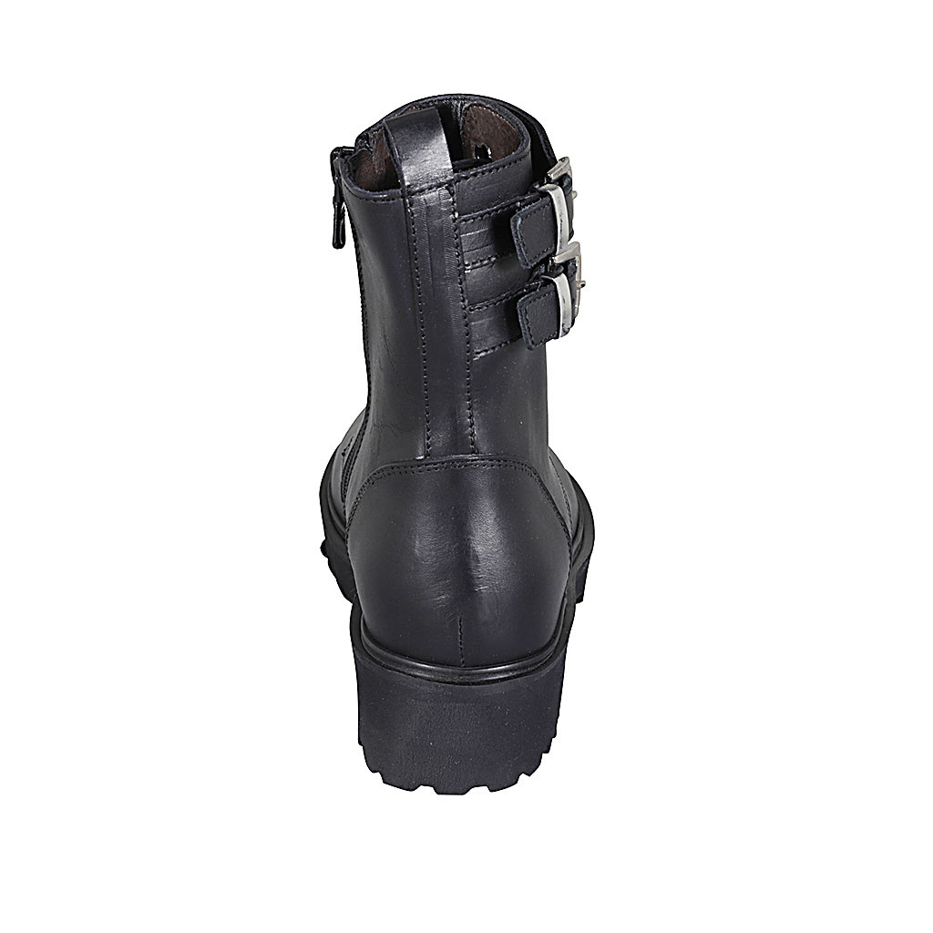 Woman's laced ankle boot with buckles, rhinestones and zipper in black leather heel 4