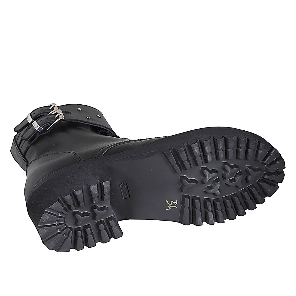 Woman's laced ankle boot with buckles, rhinestones and zipper in black leather heel 4 - Available sizes:  32, 33