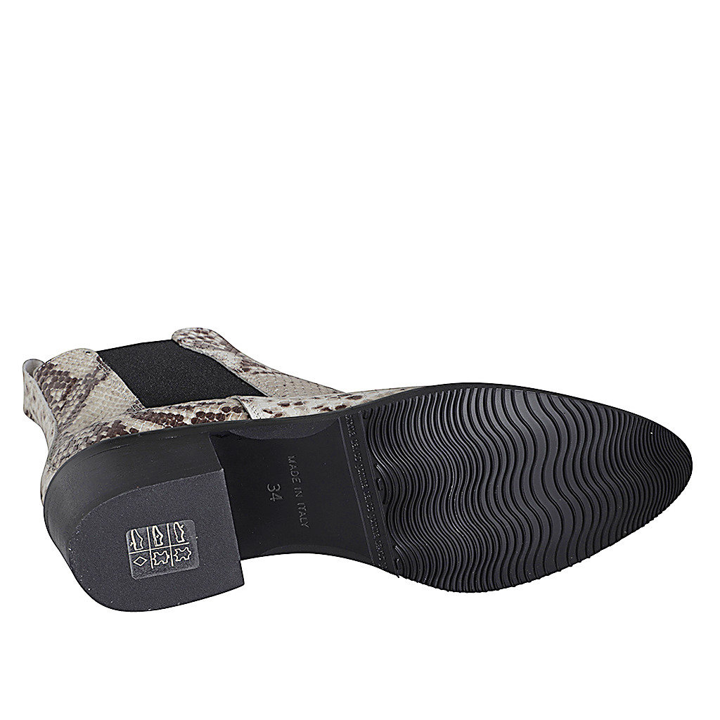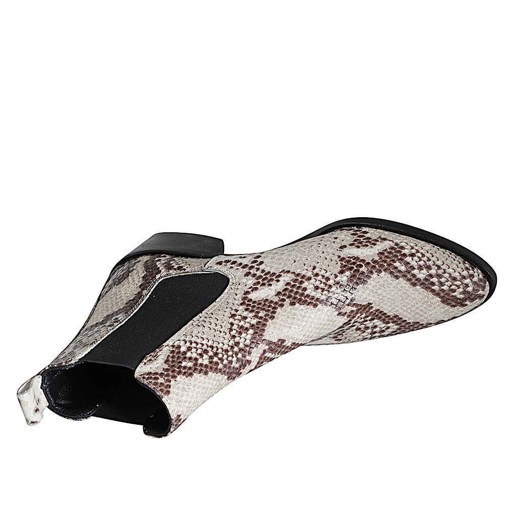 Woman's pointy texan ankle boot with elastic bands in beige and brown printed leather heel 4