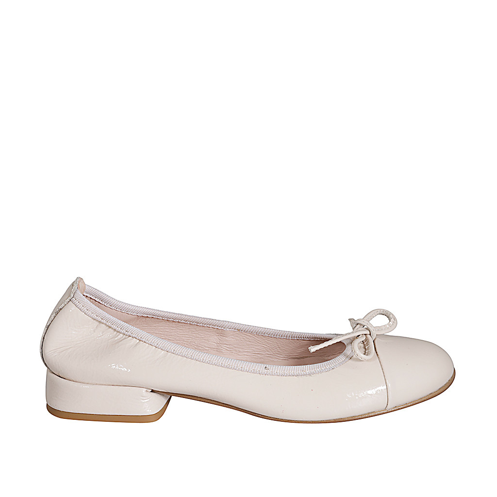 Woman's ballerina shoe in nude patent leather with bow and captoe heel 2