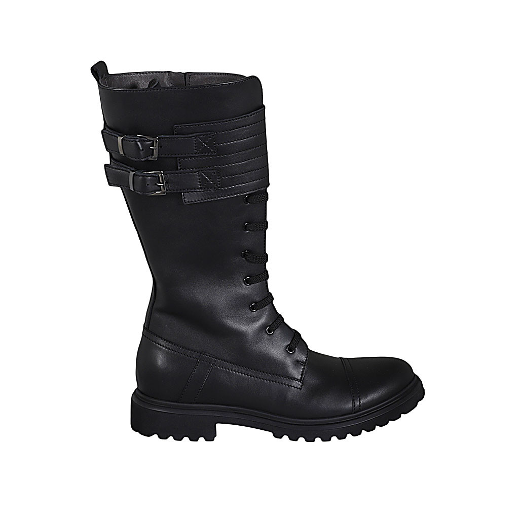 Woman's laced ankle boot with zipper and buckles in black leather heel 3 - Available sizes:  43, 44