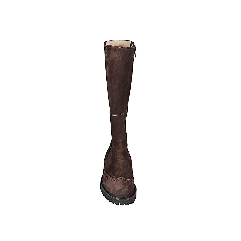 Woman's boot with tip, side elastic band, and inner zipper in dark brown suede heel 3