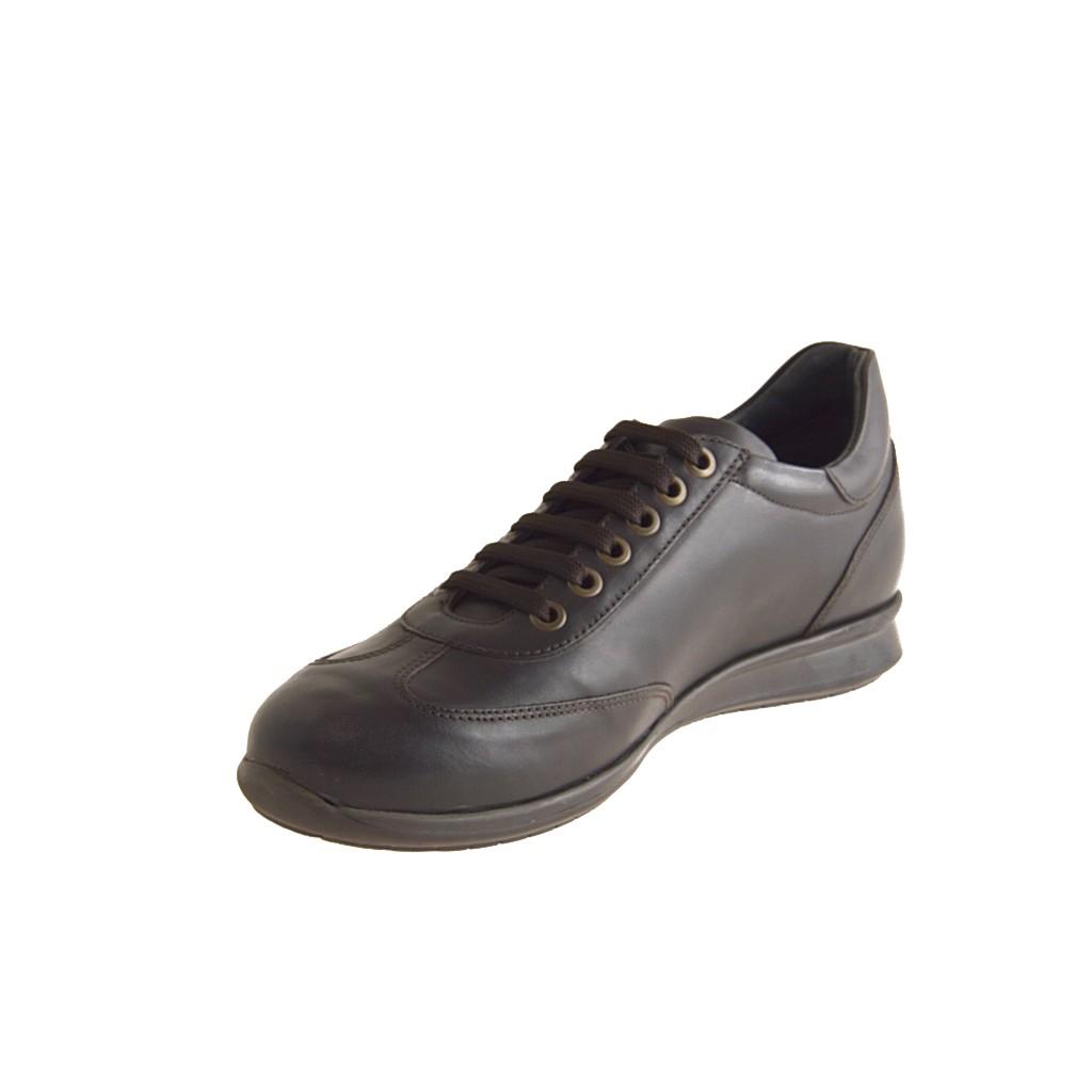 Men's laced sports shoe, in dark brown leather, rubber sole, leather lining.