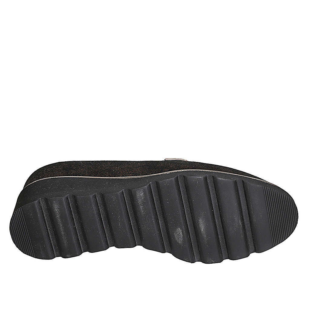 Woman's mocassin with elastic bands and removable insole in beige and brass-colored laminated suede wedge heel 4 - Available sizes:  42, 43