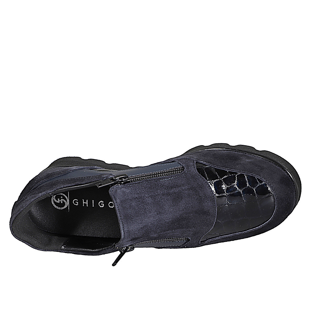 Woman's sneaker with zippers and removable insole in blue suede and printed patent leather wedge heel 3 - Available sizes:  33, 34, 35, 42, 43, 44, 45, 46