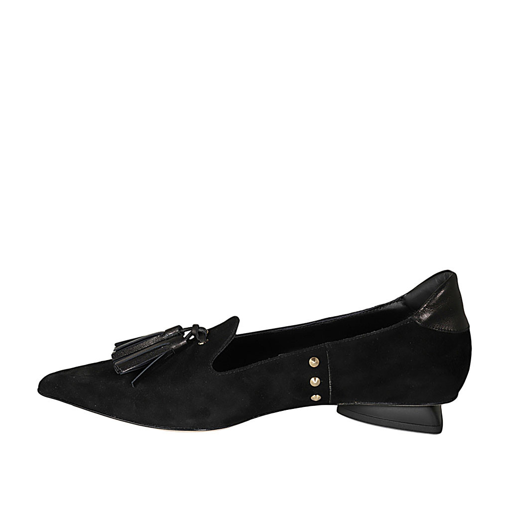 Woman's pointy mocassin in black suede and gray leather with tassels and studs heel 2 - Available sizes:  46