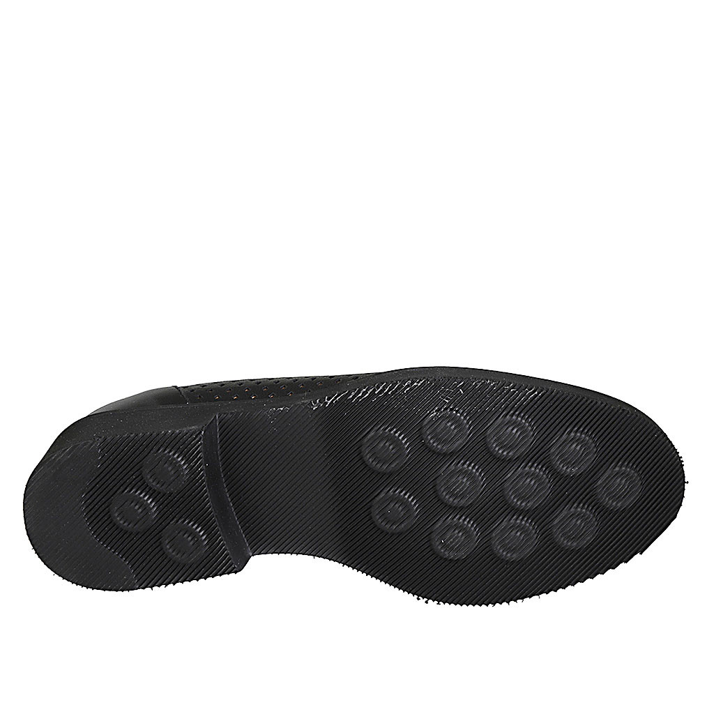 Woman's pointy mocassin in black crackled leather with accessory and bow heel 2