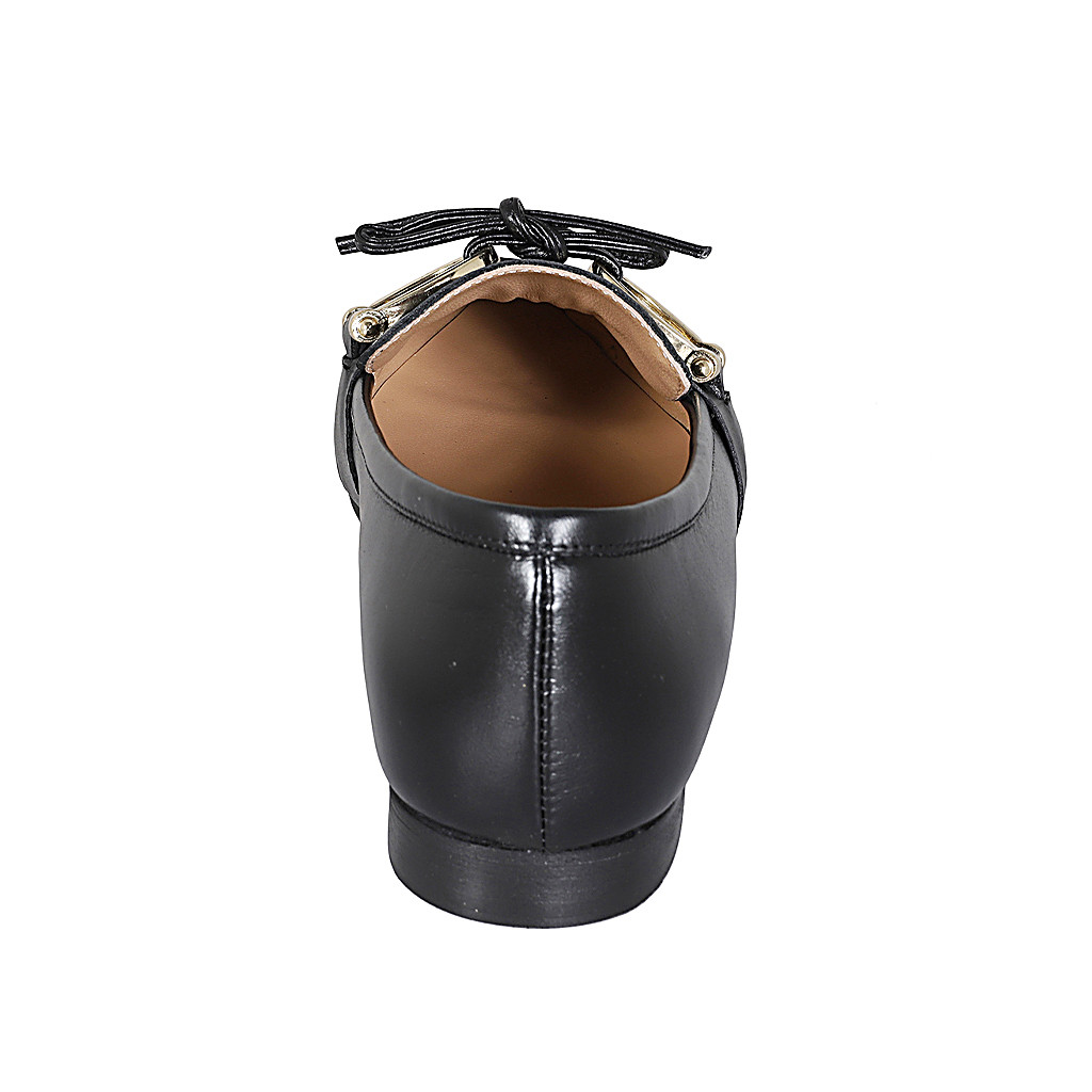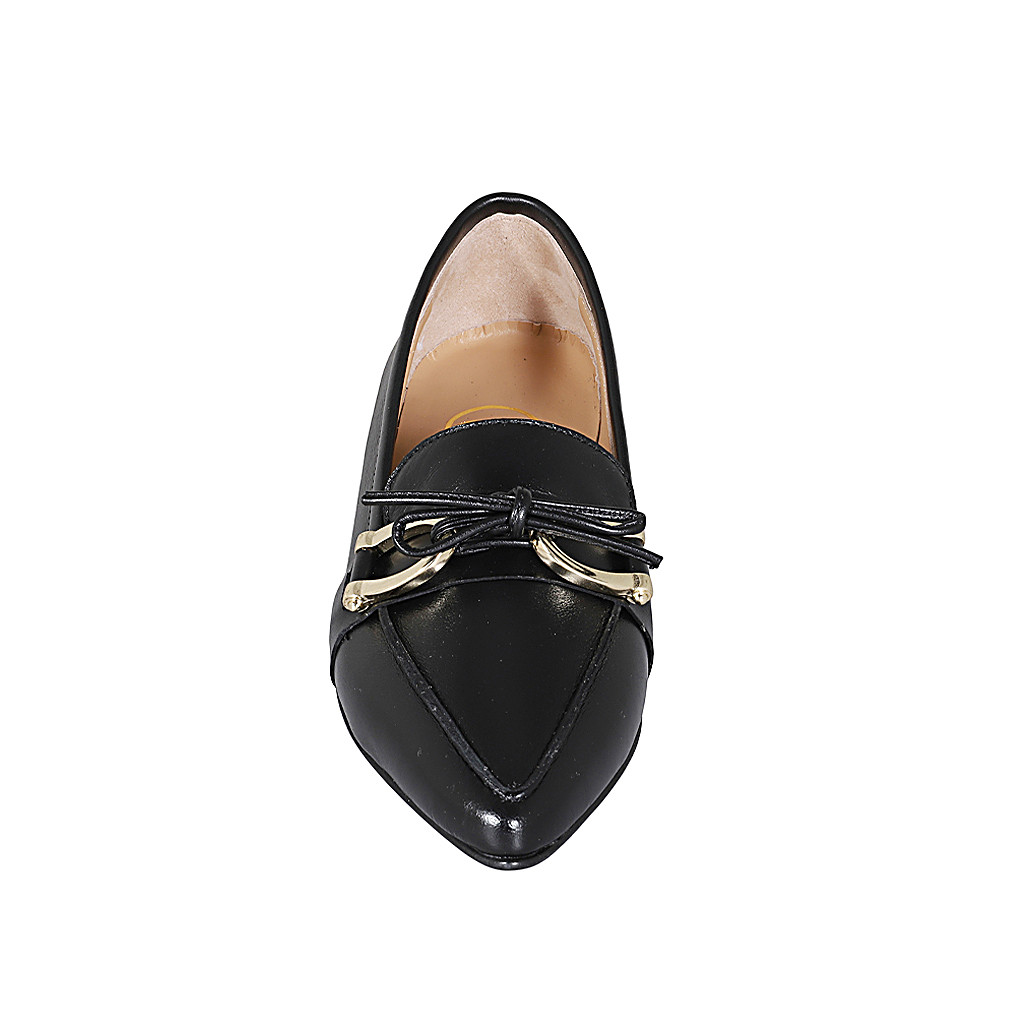 Woman's pointy mocassin in black leather with accessory and bow heel 1