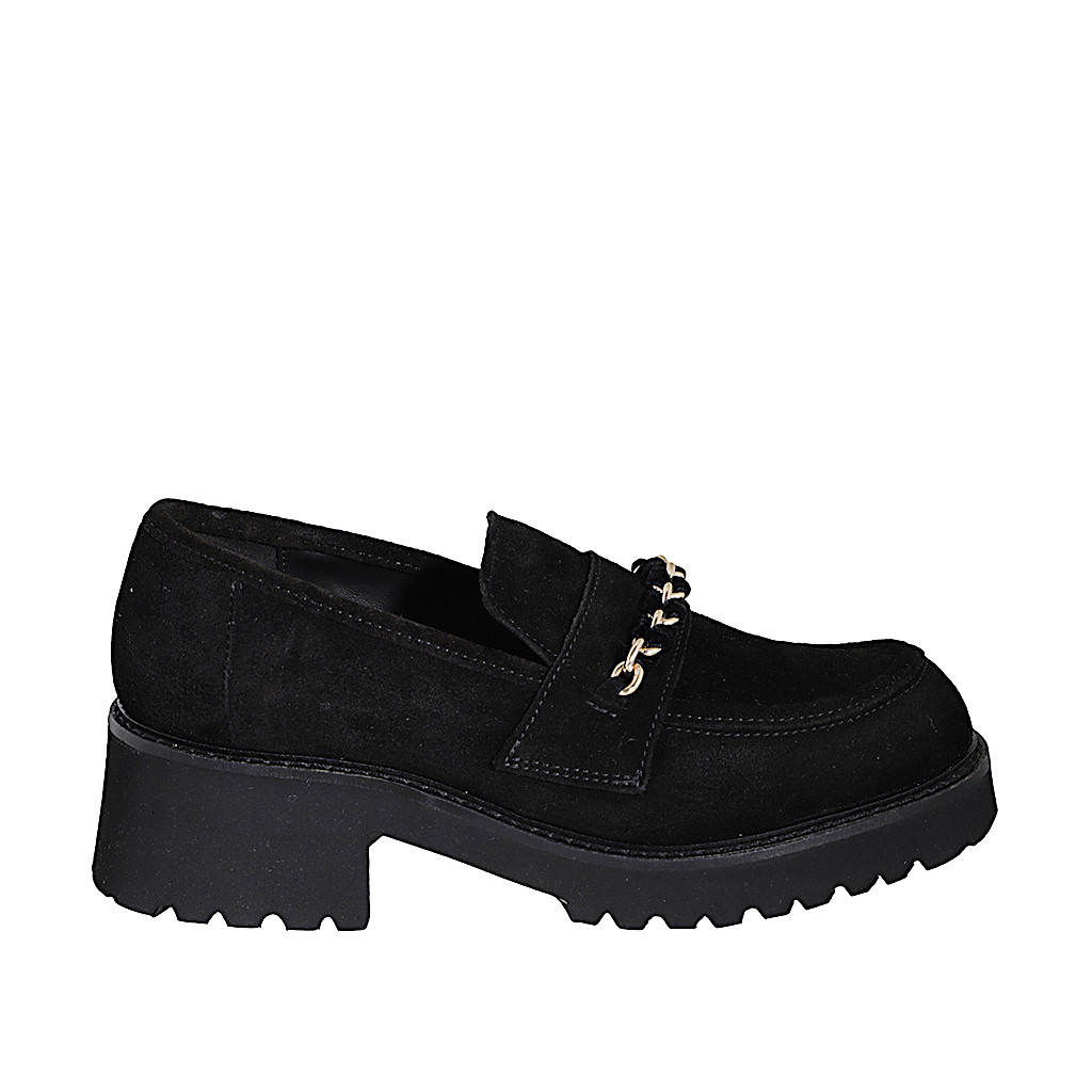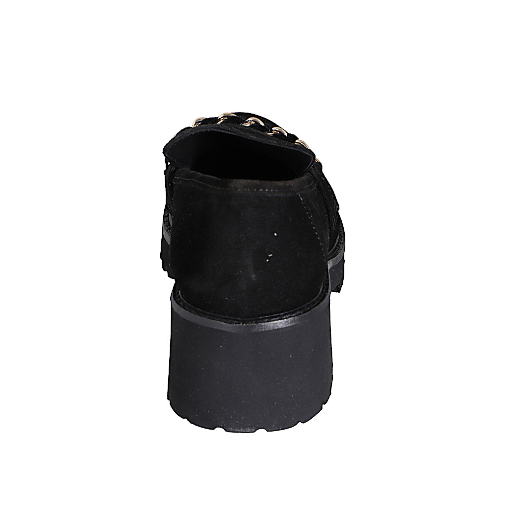 Woman's casual mocassin with gold chain in black suede heel 5 - Available sizes:  32, 33, 34, 35, 42, 43, 44, 45, 46