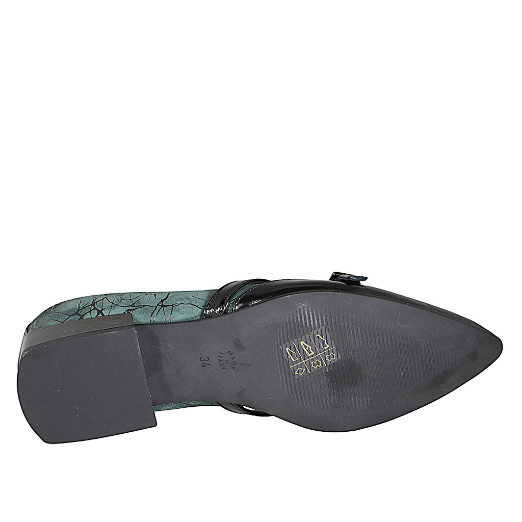 Woman's pointy mocassin with accessory in black suede and printed patent leather heel 5