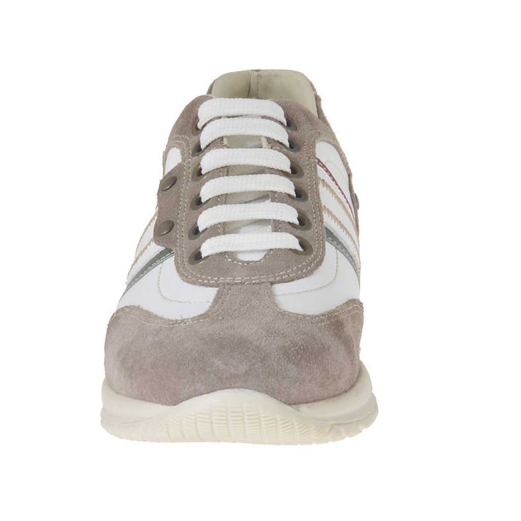 Men's sports shoe with laces in taupe suede and white, red and green leather