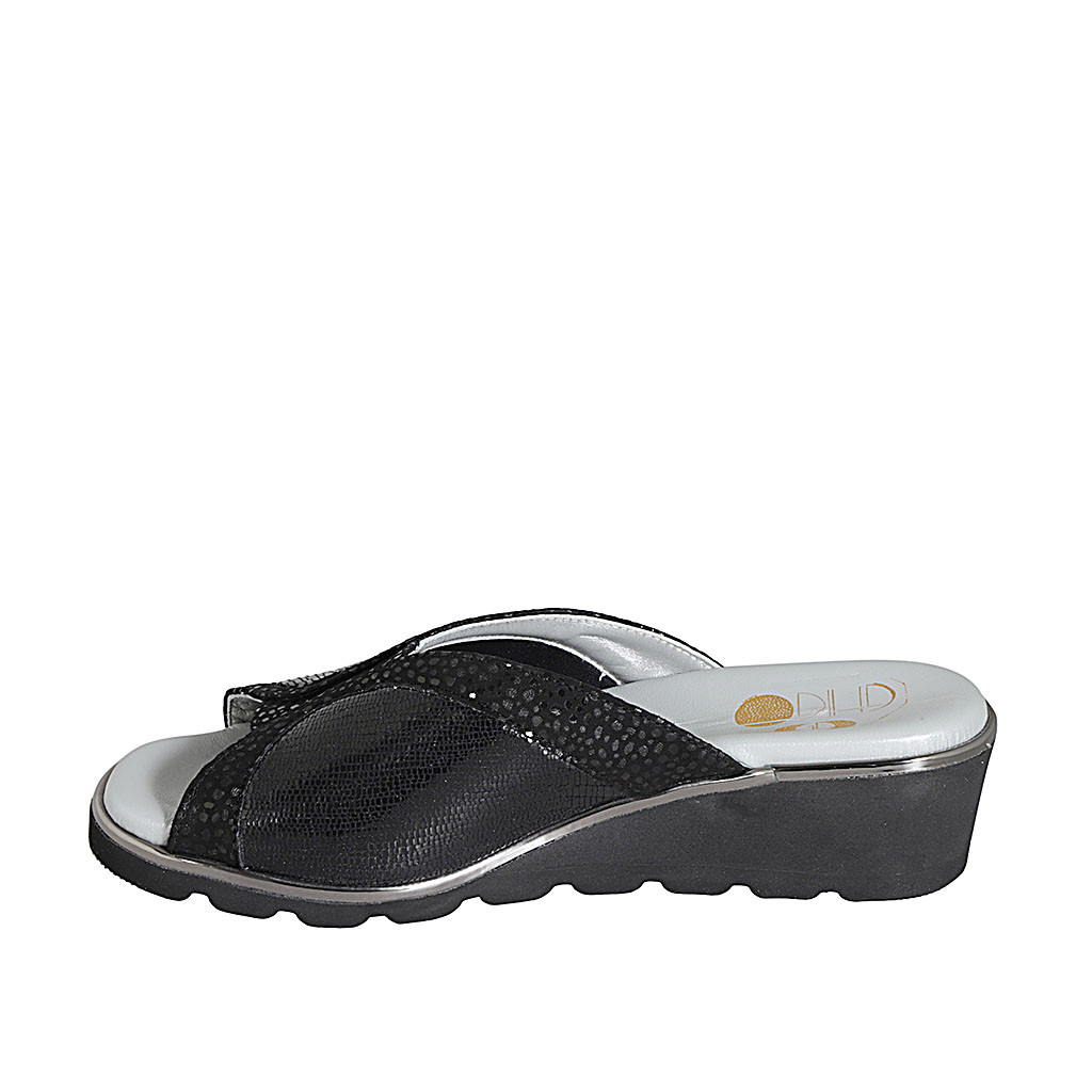 Woman's mule in black printed leather and printed suede wedge heel 4
