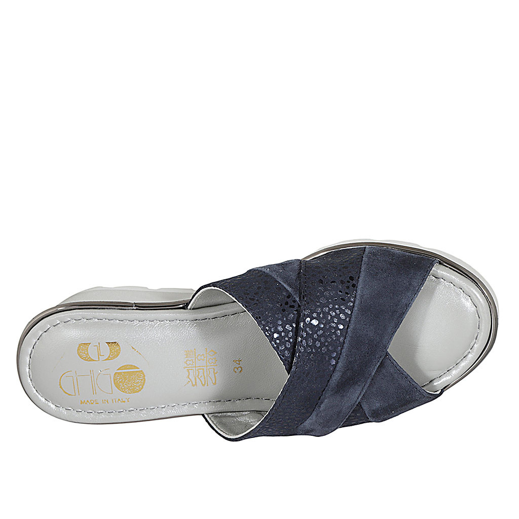 Woman's mule in blue leather and blue printed suede wedge heel 5