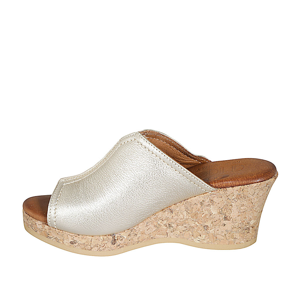 Woman's mule with platform in platinum laminated leather wedge heel 7