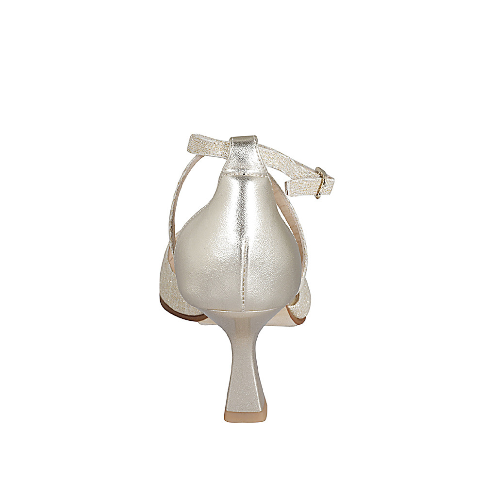 Woman's pointy open shoe with crossed strap in platinum laminated leather and glittered fabric heel 8 - Available sizes:  42