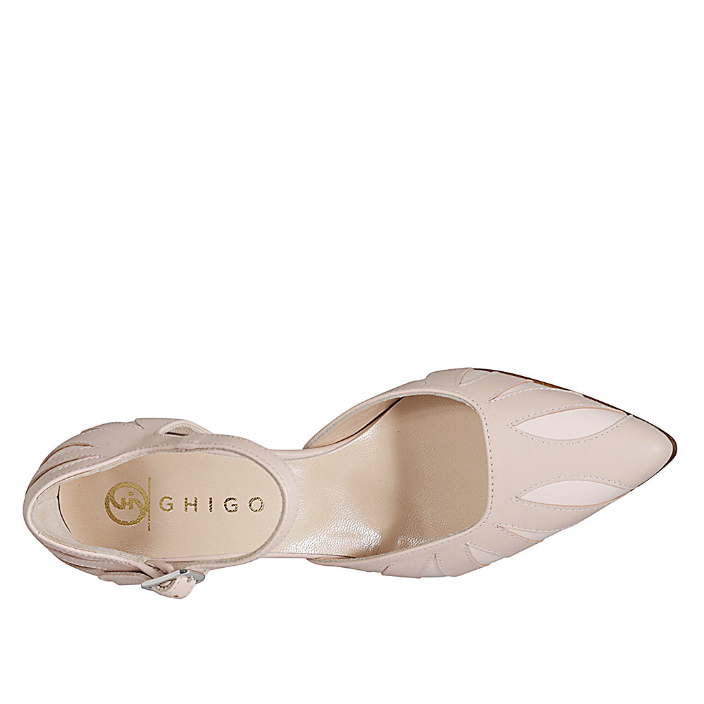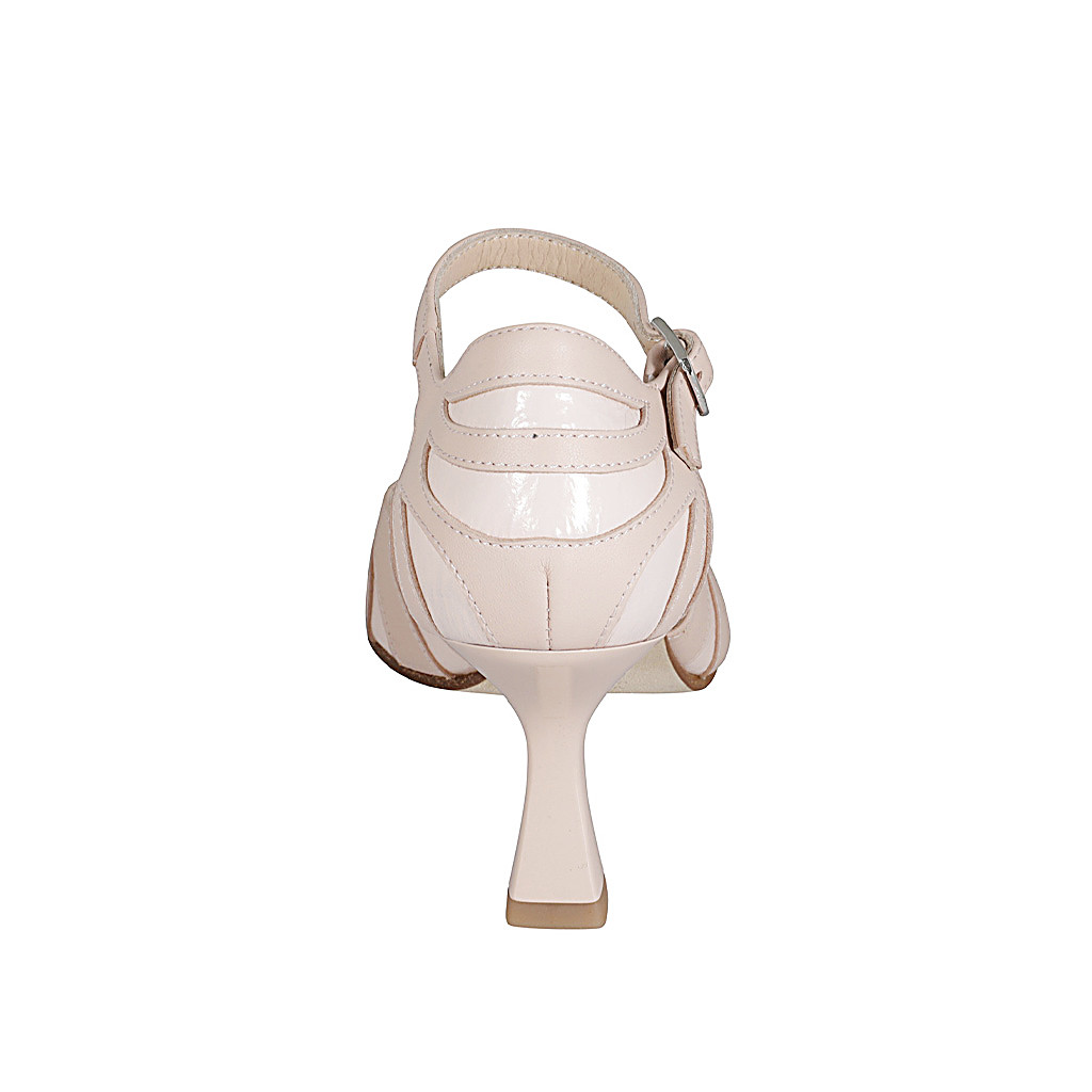Woman's pointy open shoe with strap in pink leather and light pink patent leather heel 8