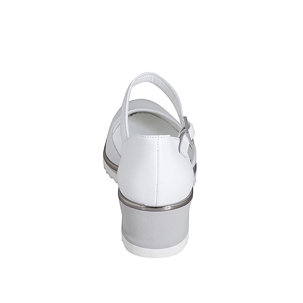 Woman's open shoe with strap in black leather and black and white raffia heel 7