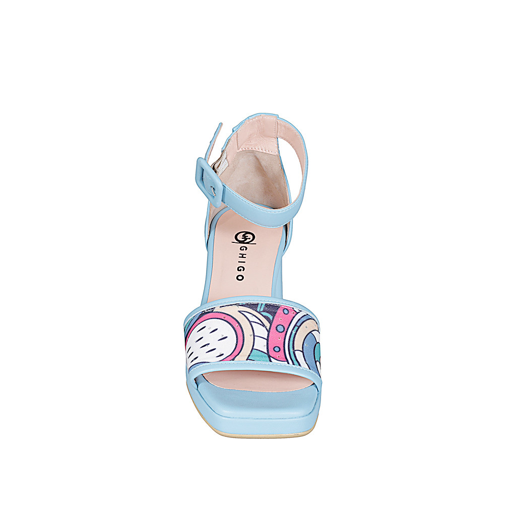 Woman's open shoe with strap and platform in light blue leather and multicolored fabric with glitter heel 7