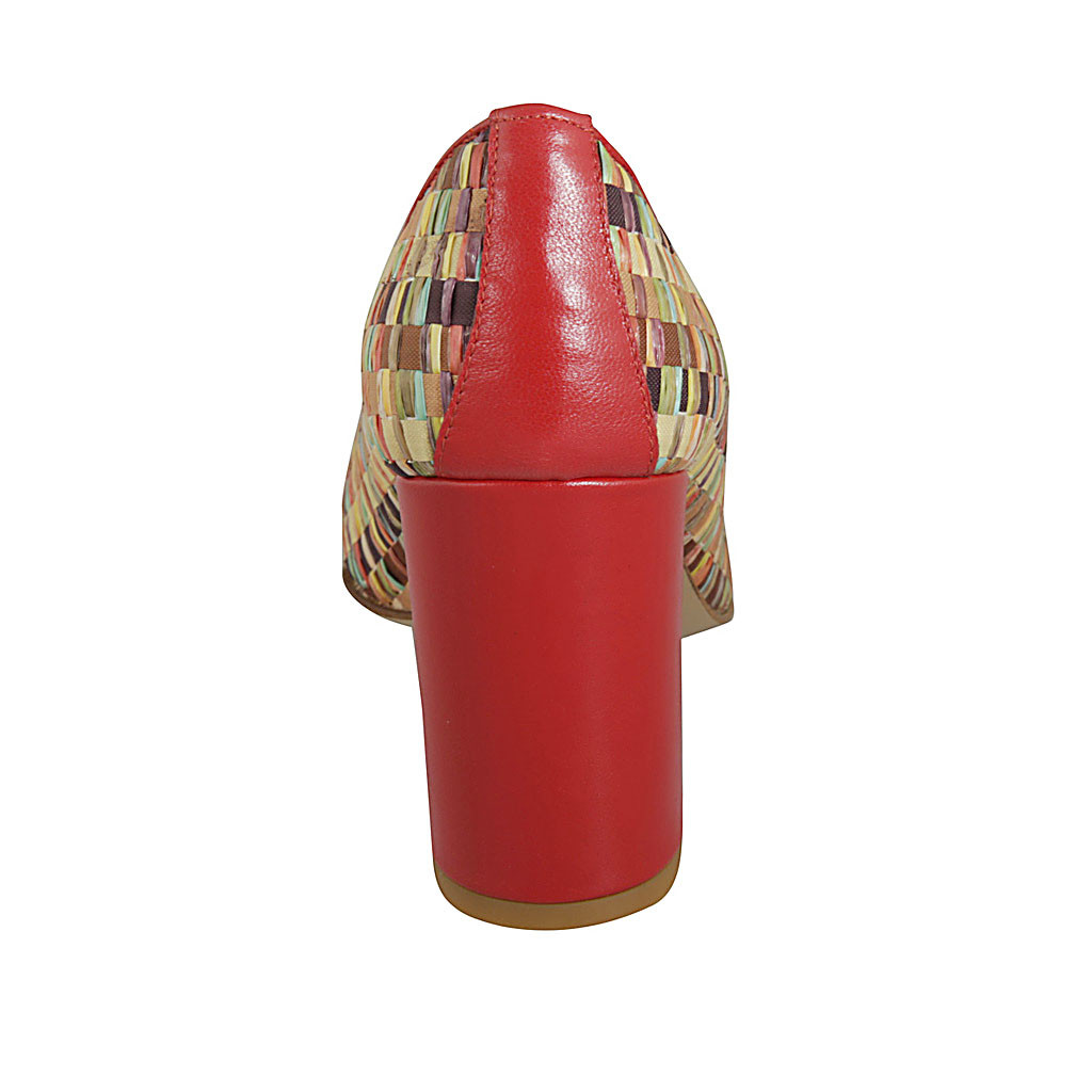 Woman's pointy pump shoe in red leather and braided multicolored fabric heel 8 - Available sizes:  42