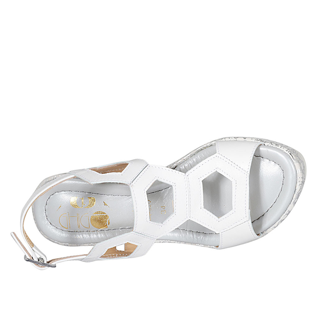 Woman's platform sandal in white leather and laminated fabric wedge heel 10