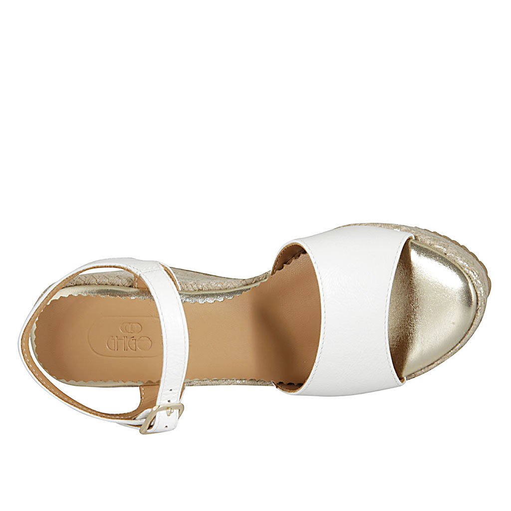Woman's platform sandal with strap in white leather and beige fabric wedge heel 9
