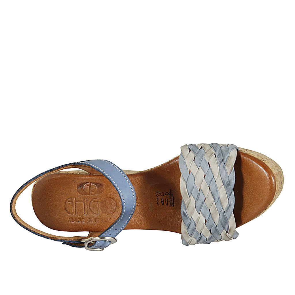 Woman's sandal in multicolored printed and blue suede wedge heel 6
