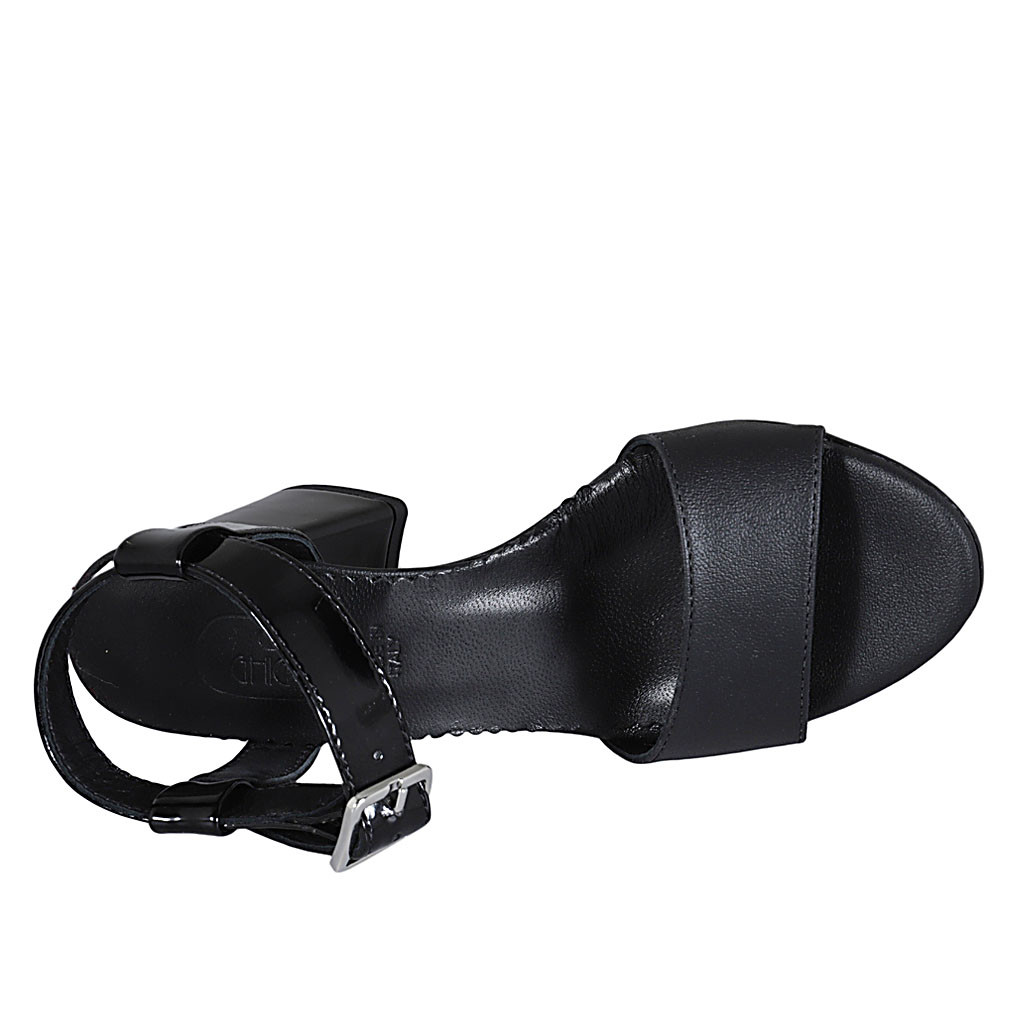 Woman's ankle strap sandal in black leather and patent leather heel 7