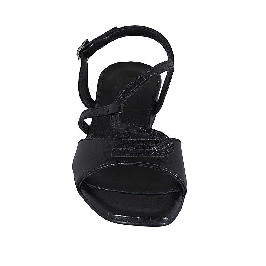 Woman's sandal in black laminated and printed leather heel 2