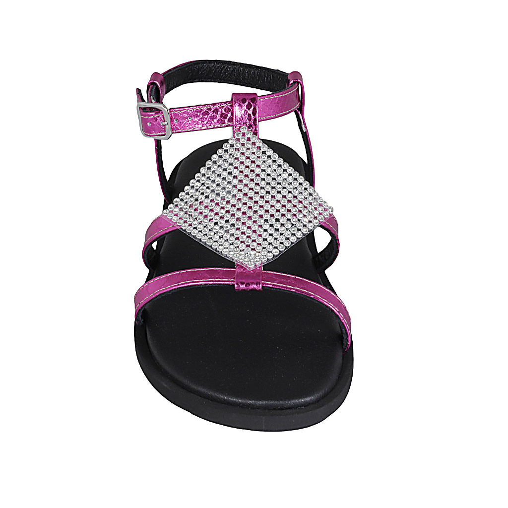 Woman's sandal in pink laminated printed leather with strap and rhinestones wedge heel 1 - Available sizes:  32, 33, 34, 42, 43, 44