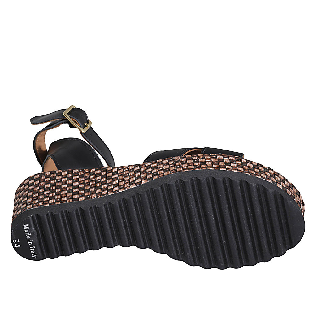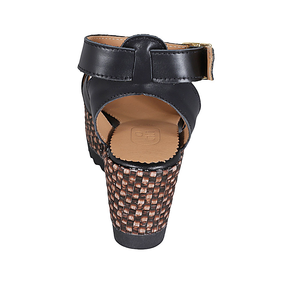 Woman's strap platform sandal in black leather with braided wedge heel 7 - Available sizes:  42