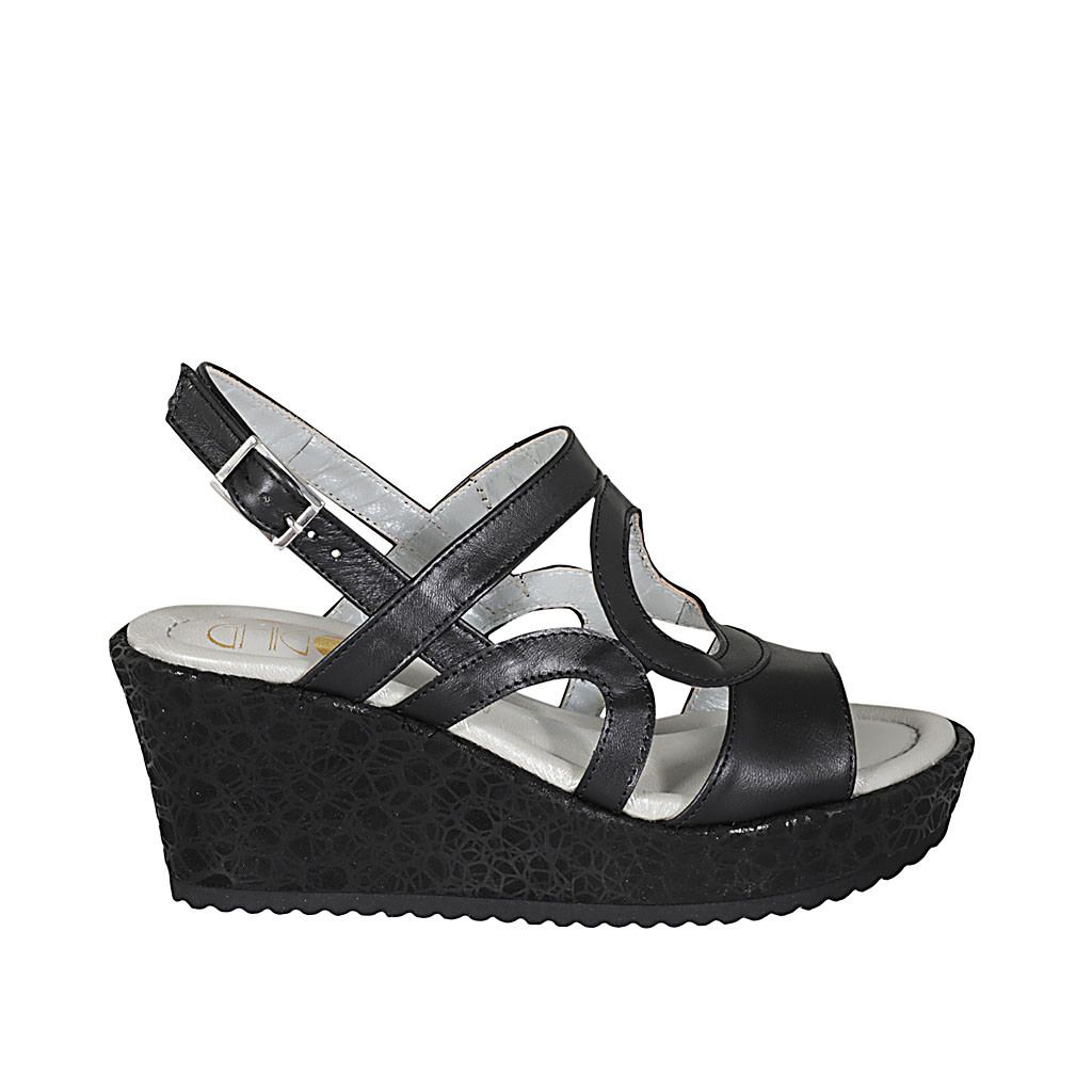 Woman's platform sandal in black leather and laminated fabric wedge heel 7 - Available sizes:  31, 42