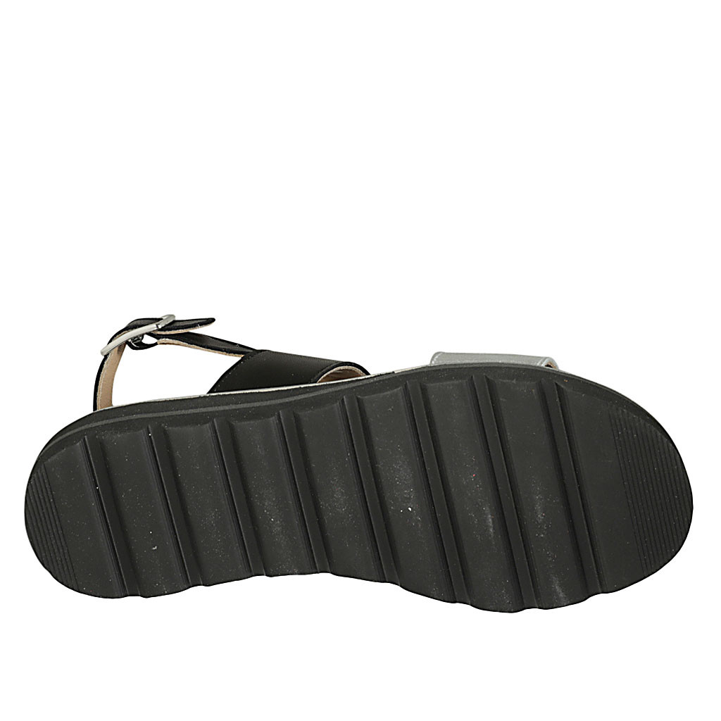 Woman's sandal with chain in black leather and silver laminated leather wedge heel 3 - Available sizes:  42