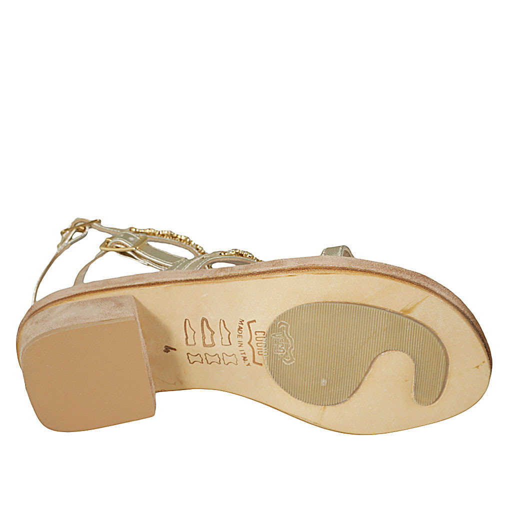 Woman's thong sandal in platinum laminated leather with rhinestones and strap heel 3