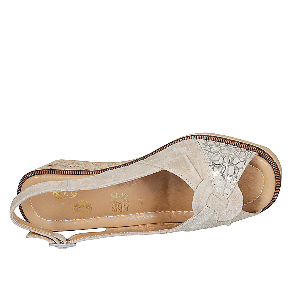 Woman's strap sandal in beige and platinum laminated suede wedge heel 6 - Available sizes:  42