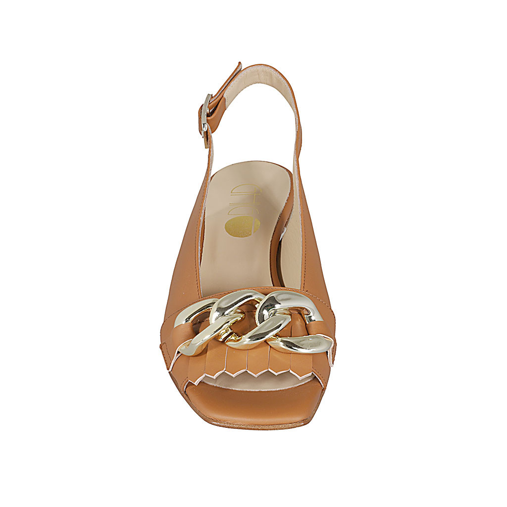 Woman's sandal with elastic and buckle in beige printed leather and suede heel 7