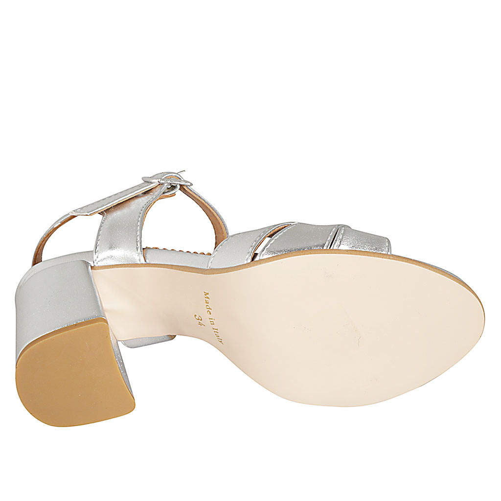 Woman's strap sandal in black leather and silver laminated leather heel 5