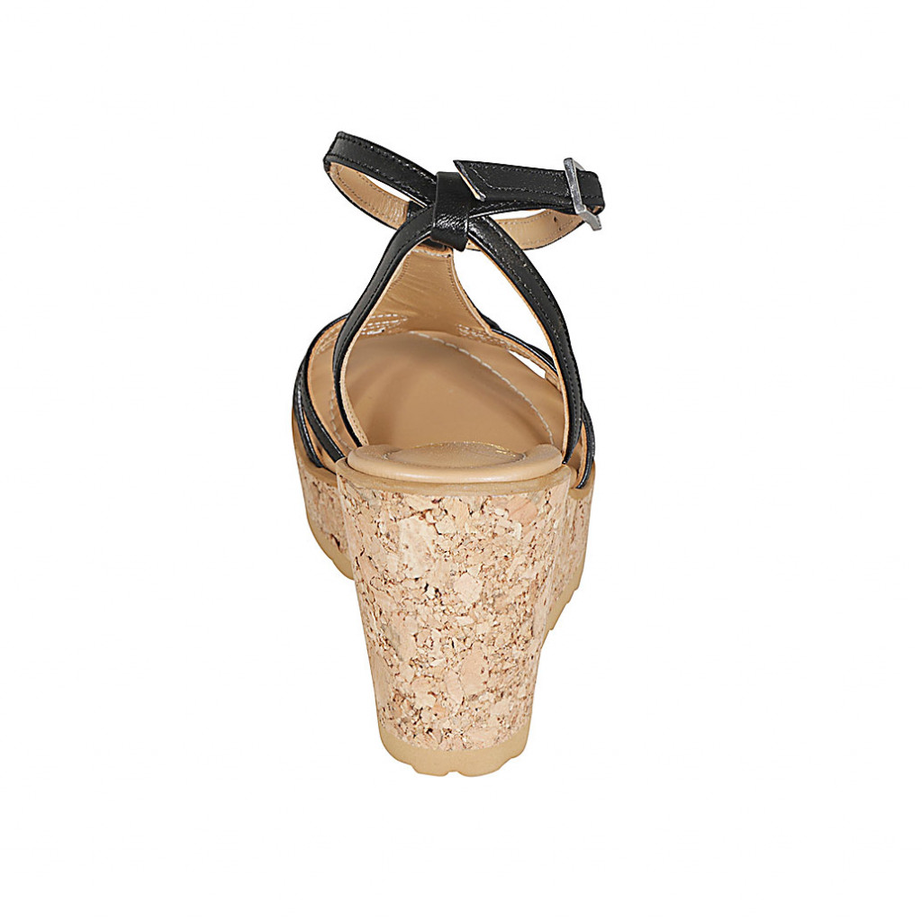 Woman's strap sandal in black leather with golden studs and platform and wedge heel 9