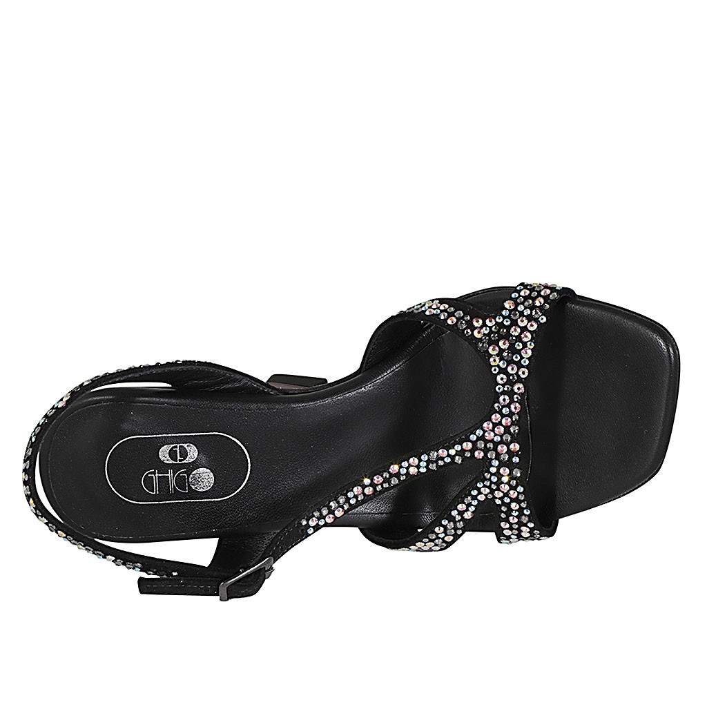 Woman's strap sandal with multicolored crystal rhinestones in black suede heel 10