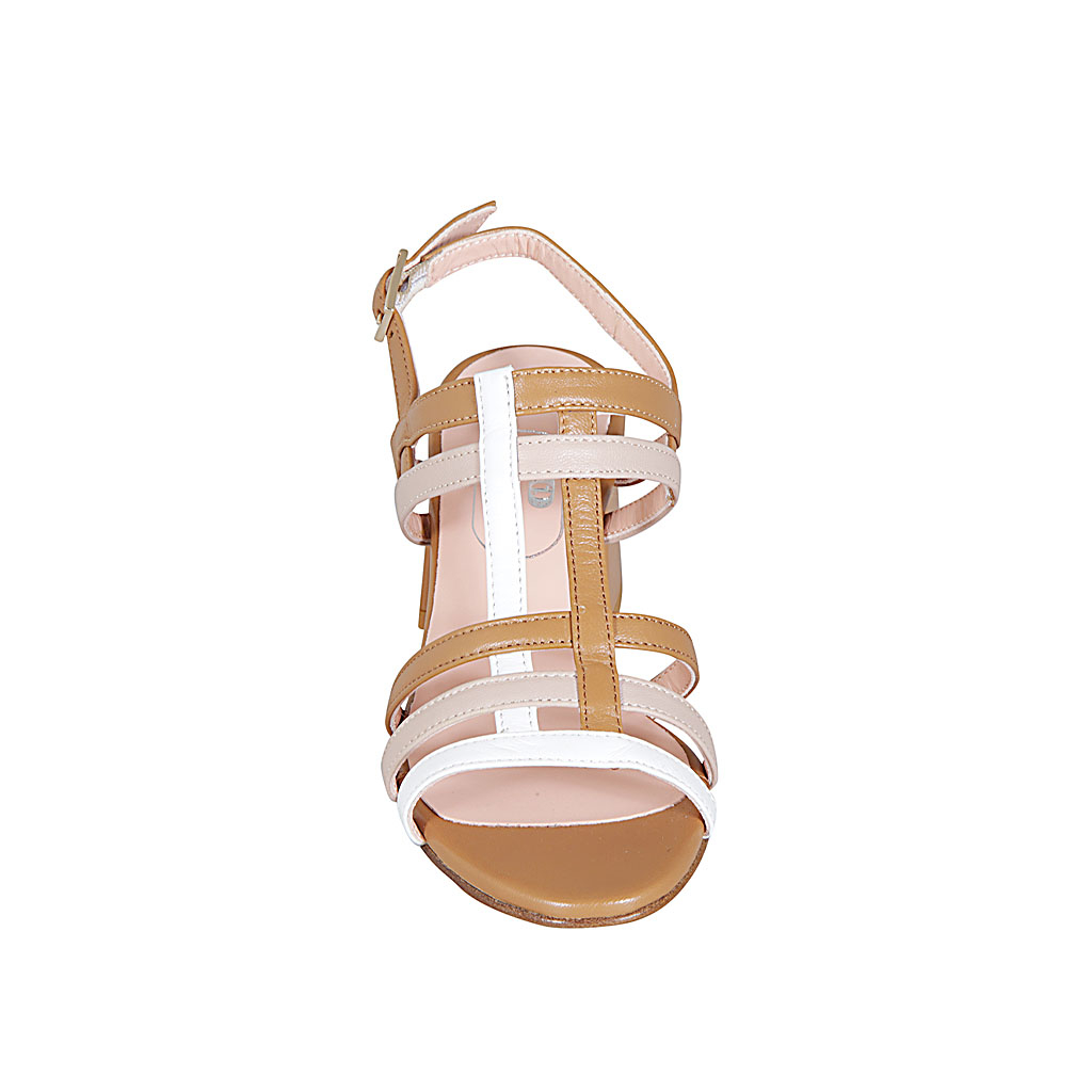 Woman's strappy sandal in cognac brown, white and nude leather heel 6 - Available sizes:  44, 45