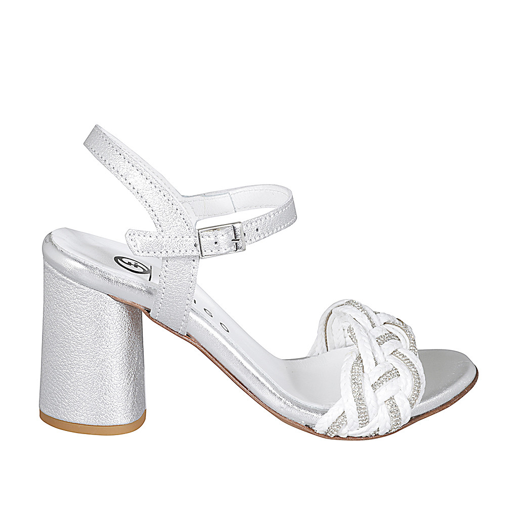 Woman's sandal in silver laminated leather and white raphia with ankle strap and rhinestones heel 7