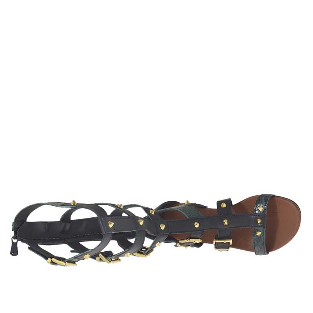 Woman's gladiator open shoe with zipper, studs and buckles, 1 cm. high heel, in black leather and green printed leather, leather sole, leather lining. Available in small and large sizes.