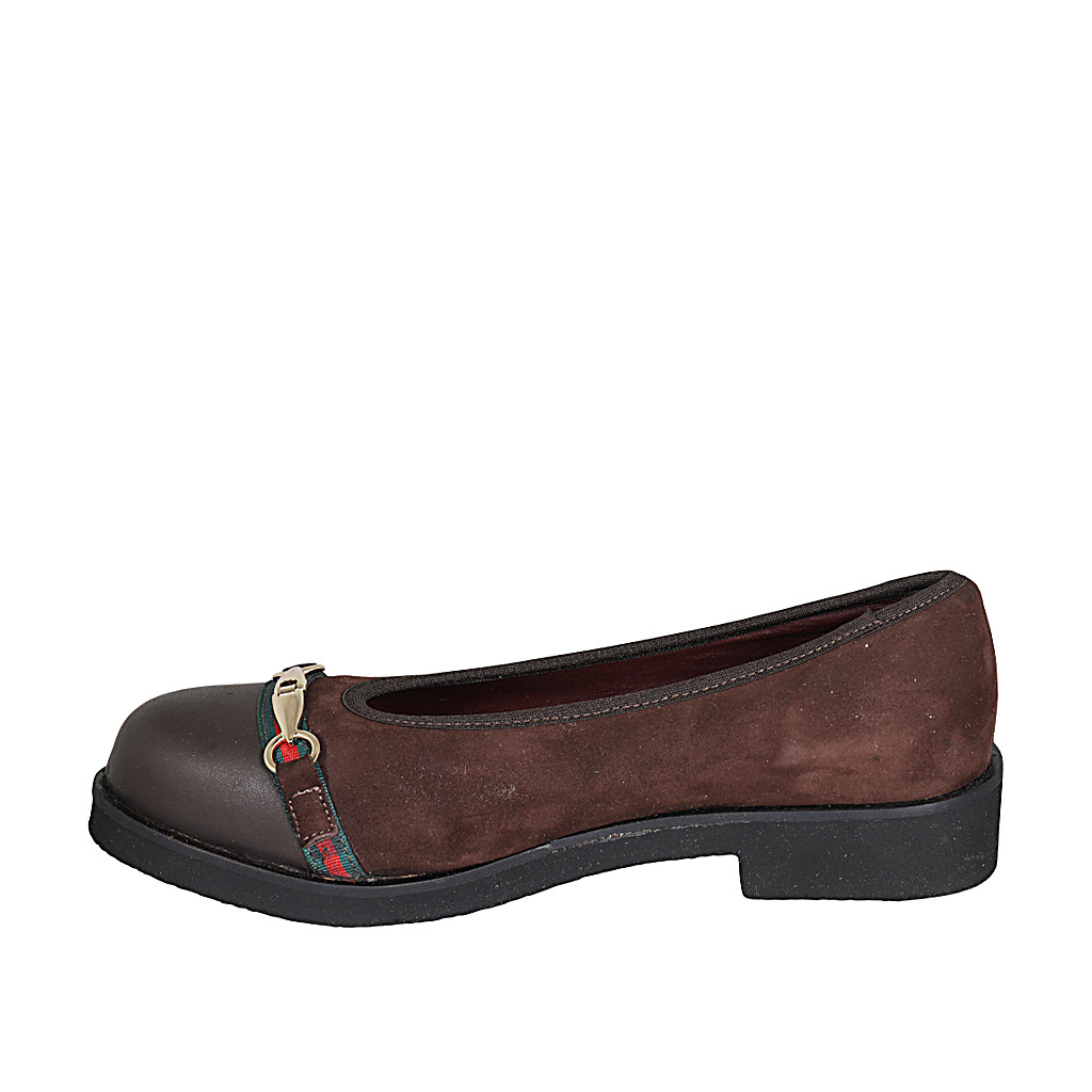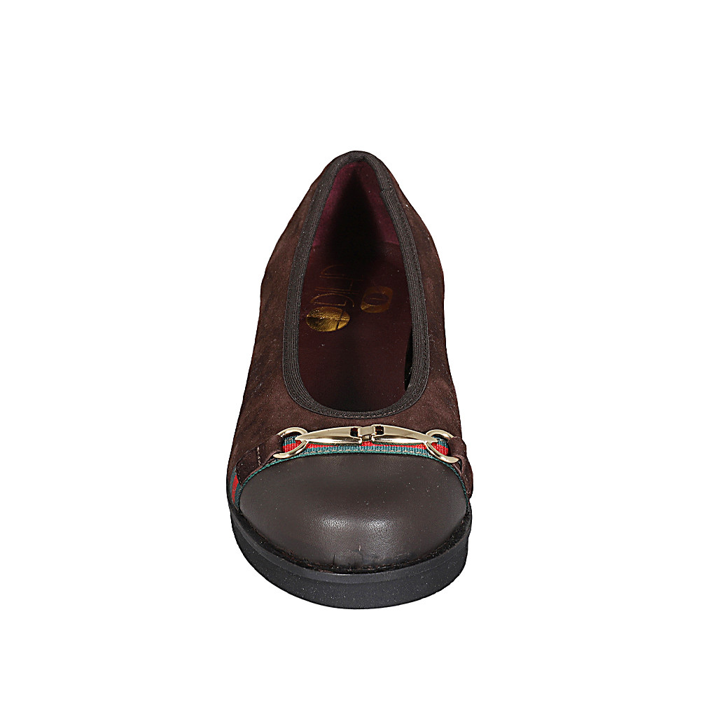 Bailarina para mujer en gamuza y piel marron con puntera y accesorio tacon 3