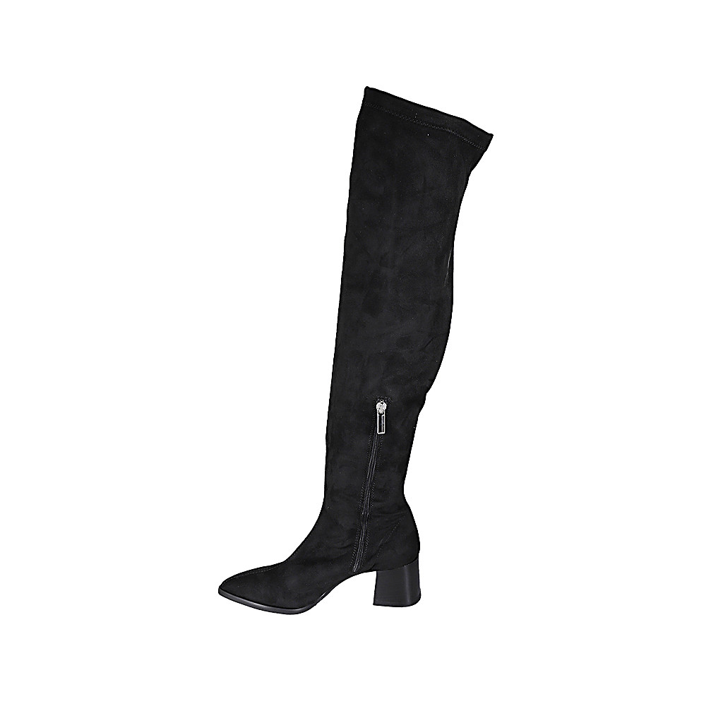 Botas a punta sobre la rodilla en gamuza y material elastico negro con media cremallera para mujer tacon 5 - Tallas disponibles:  34, 42, 43