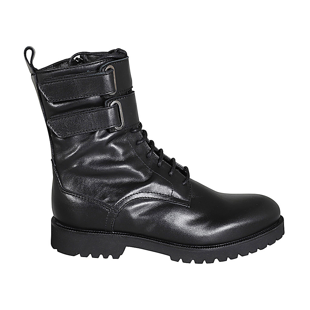 Botin para mujer con cremallera, cierres de velcro y cordones en piel negra tacon 3 - Tallas disponibles:  32, 34, 35, 43, 45, 46