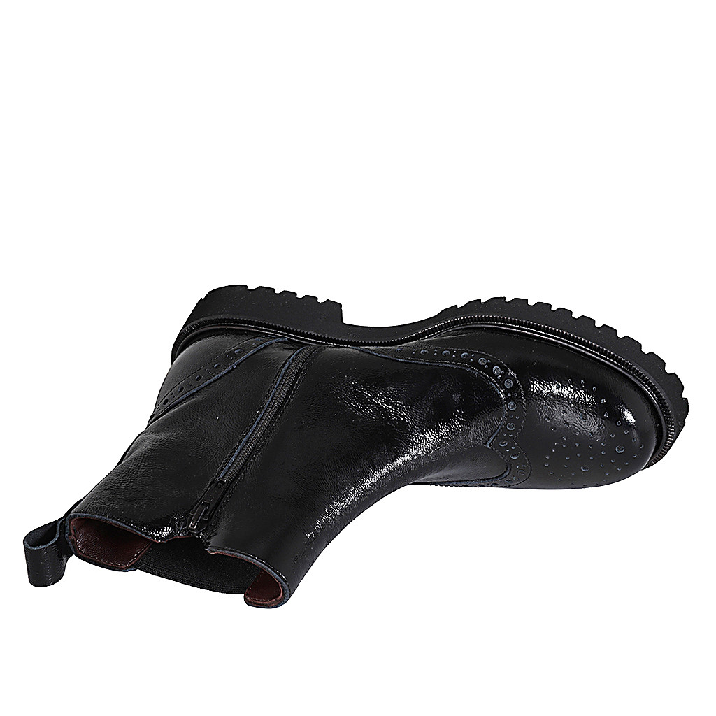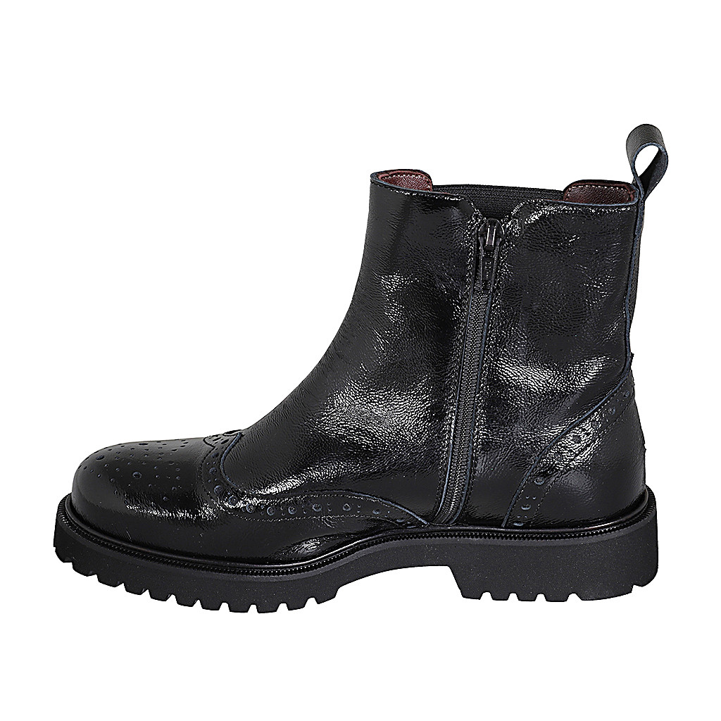 Botin para mujer con elástico, punta Brogue y cremallera en charol negra tacon 3 - Tallas disponibles:  32, 44
