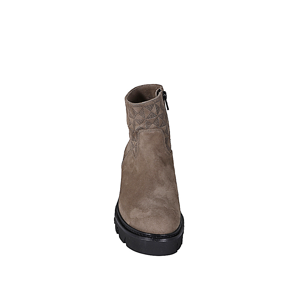 Botines para mujer en gamuza gris pardo con cremallera y diseño geométrico tacon 4