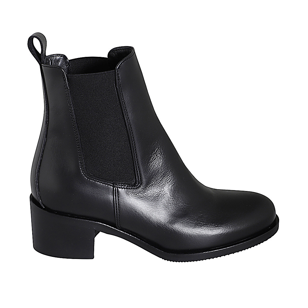 Botines para mujer con bandas elasticas en piel de color negro y tacon 5