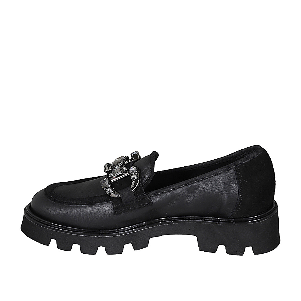 Mocasín para mujer con accesorio y estras en piel y gamuza negra tacon 4 - Tallas disponibles:  32, 33, 35, 43