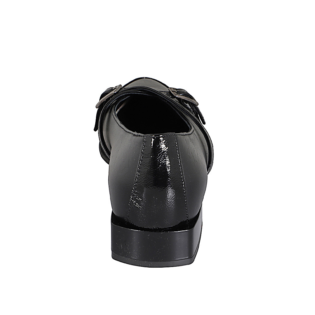 Mocasín puntiagudo para mujer con cinturones en piel y charol negro tacon 3